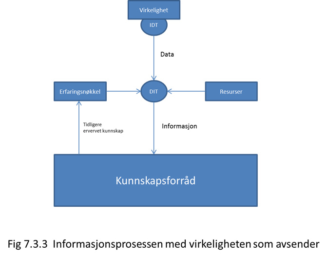 I figur 7.3.4 ser vi hvordan informasjon kan trekkes ut av et naturfenomen for å bygge opp kunnskap. Her er IDT-prosessen en naturlig fysisk prosess som er en del av, eller hele naturfenomenet. Erfaringsnøkkelen er et utvalg fra et tilgjengelig kunnskapsforråd. Den består konkret av forestillinger om hvordan fenomenet manifesterer seg for sanseapparatet.