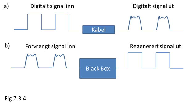 Innenfor datakommunikasjonen har man lenge visst at det er nærmest fysisk umulig å overføre rent digitale signaler over elektrisk kabel. Dette er fordi et digitalt signal (firkant-pulser, eller spenning av/på) inneholder uendelig høye frekvenser og disse kan ikke overføres via en vanlig kabel. (j.f.r. Fouriers teorem) En slik forvrengning er illustrert I fig. 7.3.4a. En slik forvrengning kan i teorien regenereres fullstendig. Ved hjelp av en boks, som "vet" formen på det digitale signalet, kan signalet opprettes til sin opprinnelige form. Dette er vist i fig. 7.3.4b.