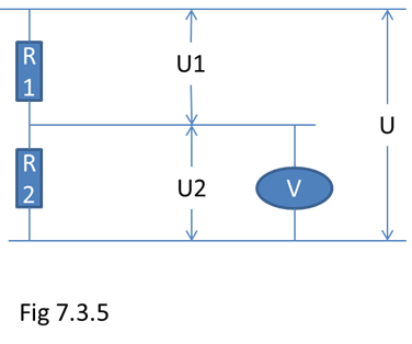 Dersom vi tenker oss to motstander koblet i serie hvor det går en bestemt elektrisk strøm. (se fig 7.3.5) Vi tenker oss at disse motstandene har høy resistans. Vi ønsker informasjon om U2 som er spenningen over R2. Til dette bruker vi et voltmeter. Vi kobler voltmetret som vist på figuren.